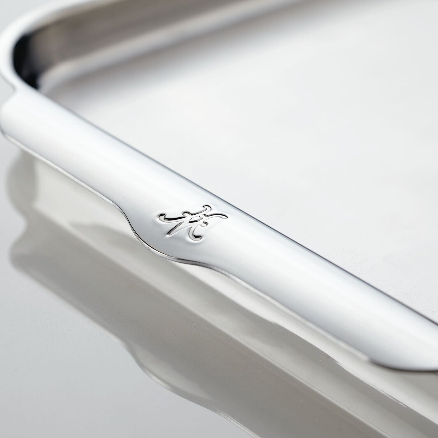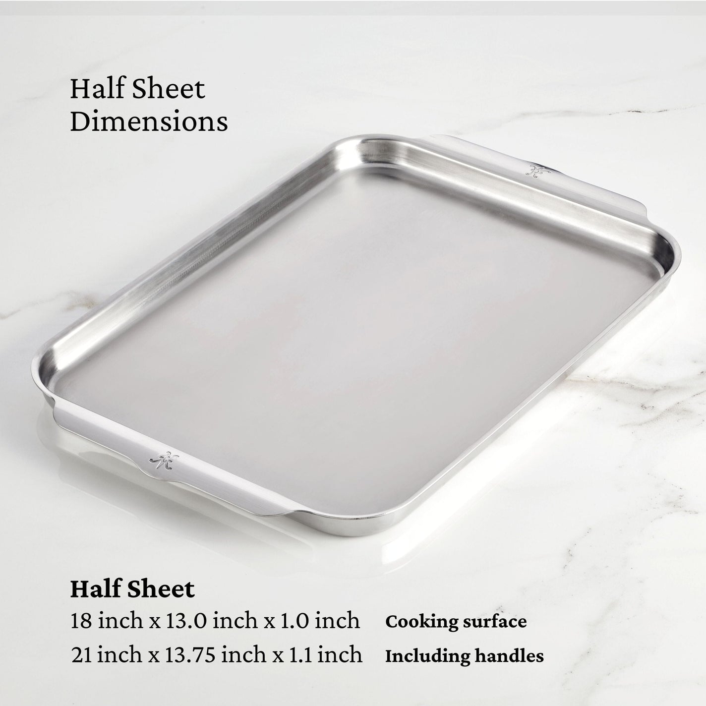Introduce exceptional craftsmanship and lasting performance to the kitchen with the Hestan Provisions OvenBond Stainless Steel Half Sheet Pan. This half sheet pan is crafted from triple-bonded clad stainless steel with a responsive aluminum core designed to evenly emit heat, producing beautifully browned goods and perfectly roasted foods. Warp-resistant clad pan features wide curved handles, providing an easily accessible, firm hold when removing from the oven, even when wearing oven mitts. Brushed stainless steel interiors and polished exteriors give these pans a lasting aesthetic that keeps them looking newer, longer. This gourmet roasting pan is broiler safe and oven safe to 600°F to accommodate a wide range of recipes.