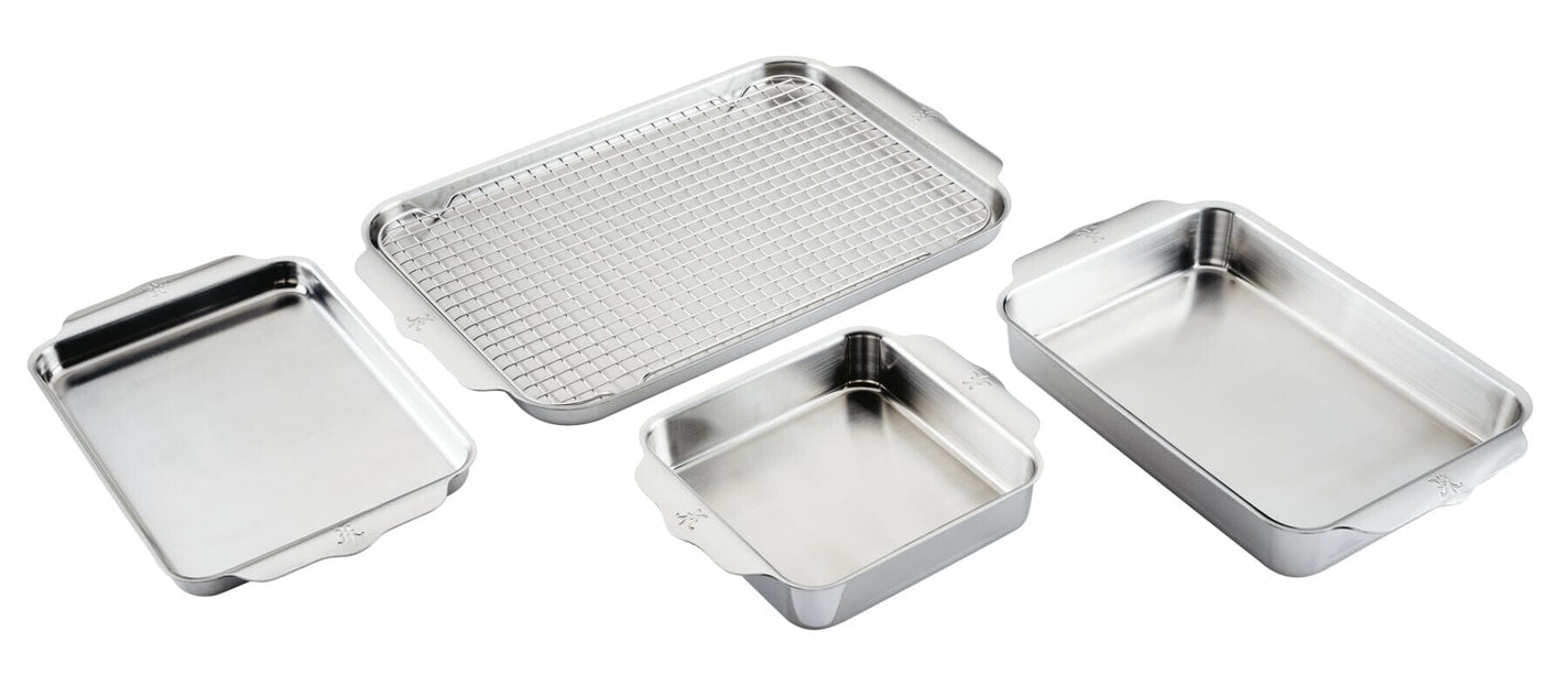 Introduce exceptional craftsmanship and lasting performance to the kitchen with the Hestan Provisions OvenBond Set. This five-piece set includes bakers and sheet pans crafted from triple-bonded clad stainless steel with a responsive aluminum core designed to evenly emit heat, producing beautifully browned goods and perfectly roasted foods. Warp-resistant clad bake pans feature wide curved handles, providing an easily accessible, firm hold when removing the baking sheets from the oven, even when wearing oven mitts. Brushed stainless steel interiors and polished exteriors give these pans a lasting aesthetic that keeps them looking newer, longer. This gourmet ovenware set is broiler safe and oven safe to 600°F to accommodate a wide range of recipes.