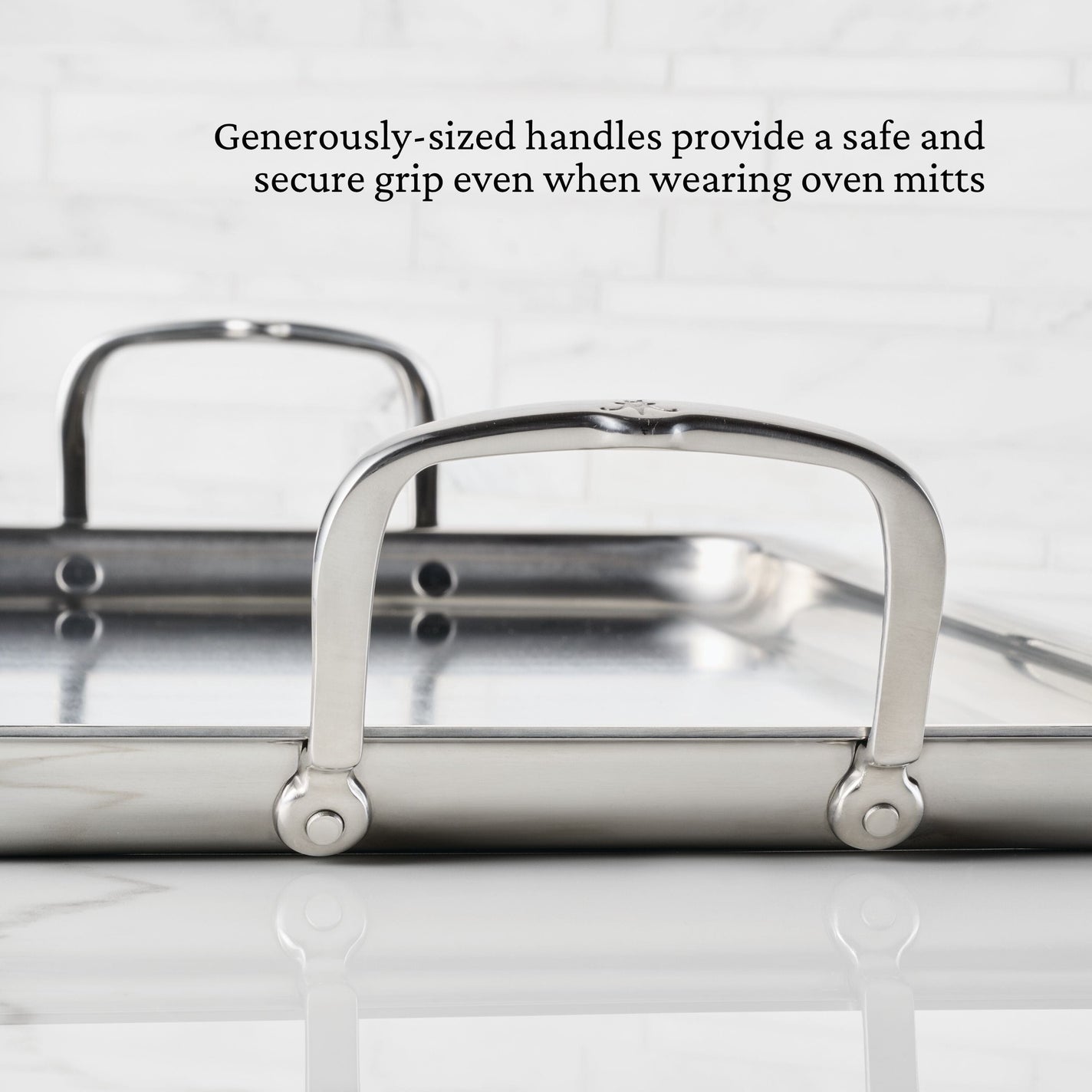 SECURE HOLD: Griddle features wide, pronounced handles that offer a firm hold when transferring from stovetop, to oven to table, even while wearing oven mitts. SUPERIOR PERFORMANCE: Griddle boasts exceptional heat conductivity, and is broiler and oven safe to 600°F to accommodate a wide range of searing and roasting needs.