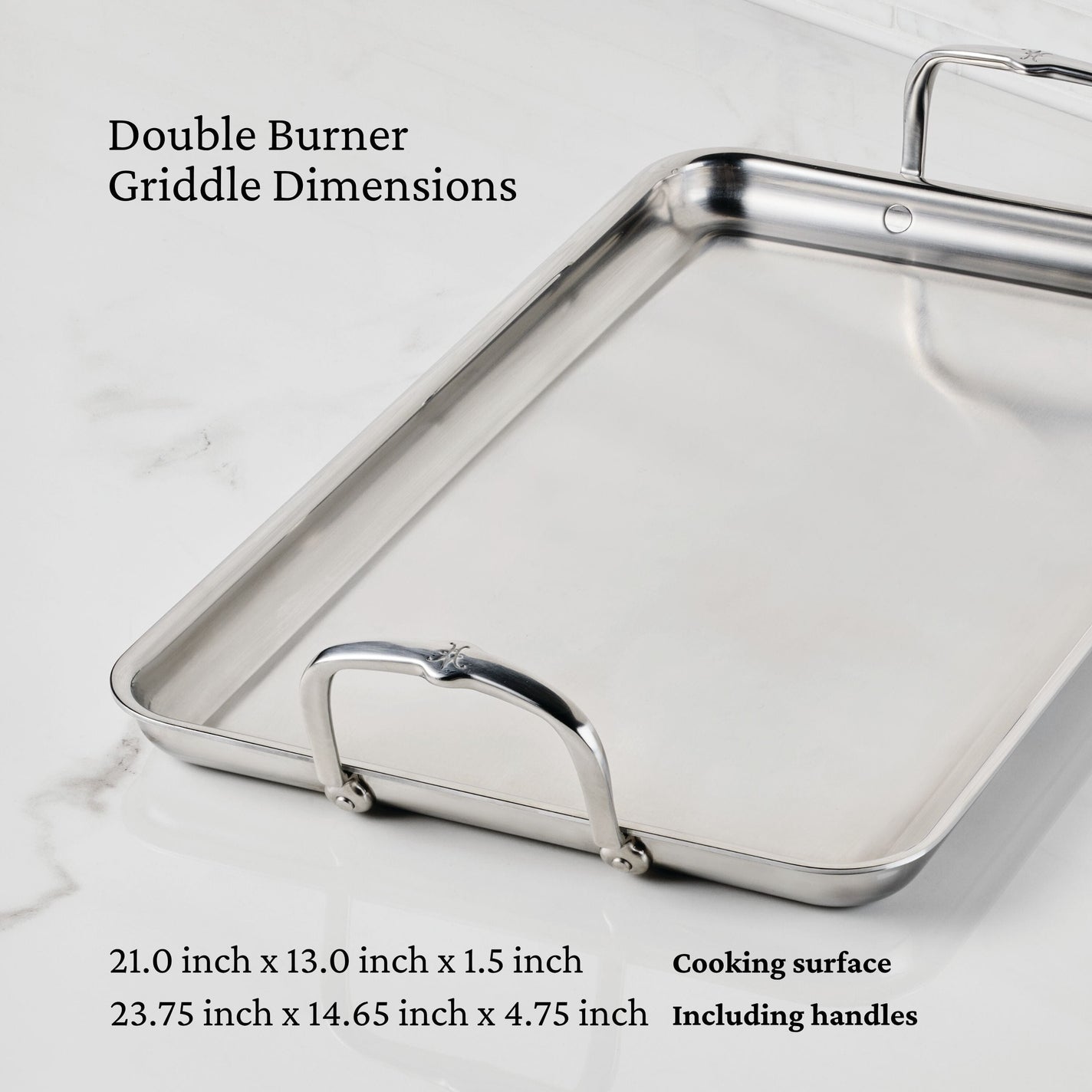 CLAD CONSTRUCTION: Triple-bonded, stainless steel Double Burner Griddle features a thick aluminum core for superior heat conductivity and is induction suitable. INCOMPARABLE BEAUTY: Double Burner Griddle features a brushed stainless steel cooking surface and mirror polished exterior bringing a modern and luxurious look to your kitchen.