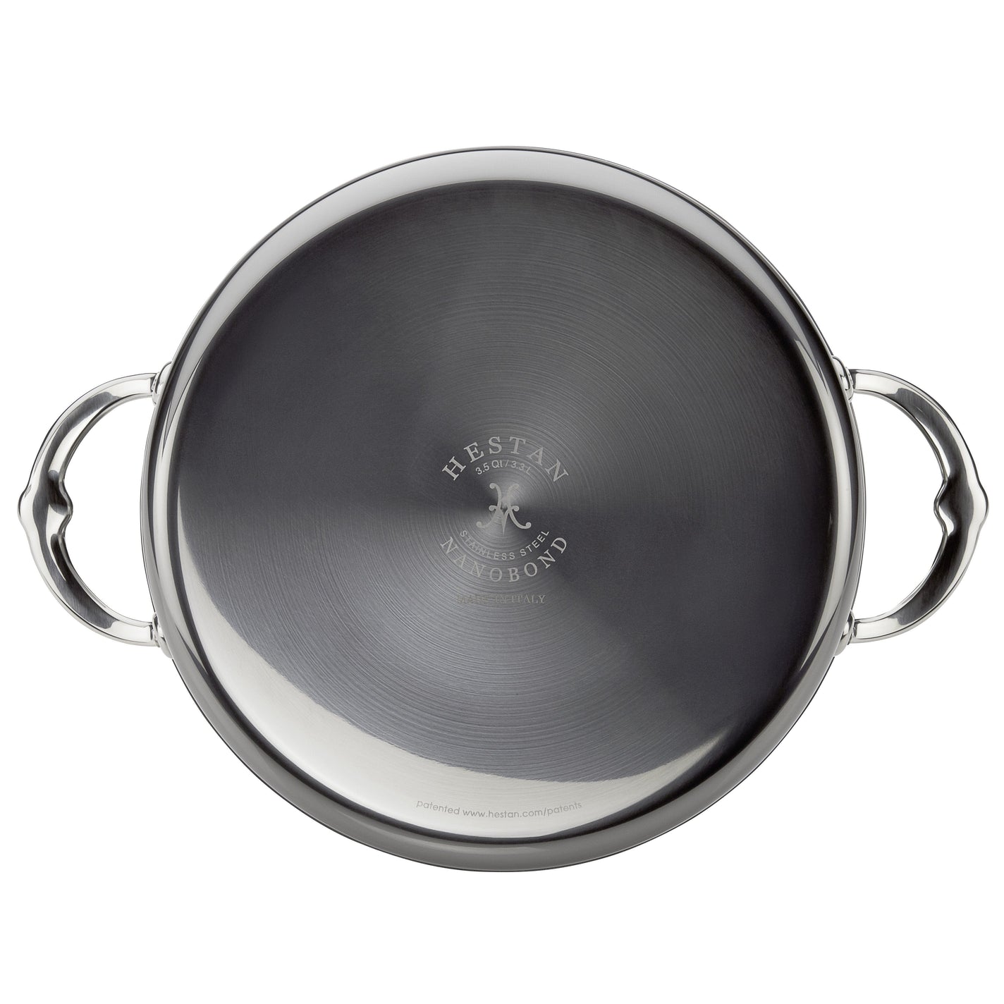 For groundbreaking innovations in cookware, equip the kitchen with a Hestan NanoBond Molecular Titanium Stainless Sauteuse. This spacious pan is designed for greater heat conduction for better browning, searing, and braising. Hestan's innovative cookware technology, Molecular Titanium, bonds thousands of titanium nano-layers to the stainless steel construction, creating a brilliantly resilient cooking surface 4X harder than typical stainless steel, making it resistant to scratching, staining, and salt pitting. This 100% nonreactive sauteuse is fitted with ergonomic handles for a comfortable grip when cooking and serving culinary creations. The pan is also designed to provide 20% more surface area than traditional in its size class. High heat and oven safe to a scorching 1050°F, this Italian handcrafted saute pan offers a lifetime durability for culinary perfection.
